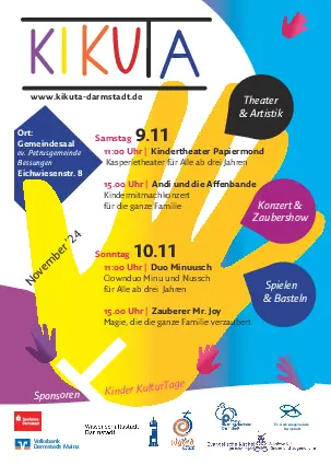 KiKuTa-Darmstadt 2024, am Samstag den 09.11. werden um 11 Uhr die KinderKulturTage Darmstadt 2024 zum dritten Mal ihre Pforten in der Eichwiesenstraße 8 in Bessungen (Gemeindehaus der Petrusgemeinde) öffnen.