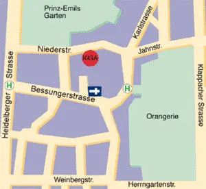 Unsere Einrichtung liegt im Herzen Bessungens zwischen Orangerie und Prinz-Emils-Garten und ist mit öffentlichen Verkehrsmitteln gut zu erreichen: