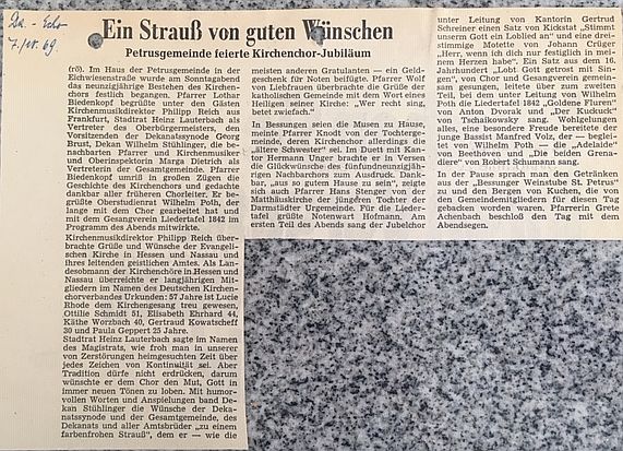 Die Bessunger Kantorei wurde am 15. März 1879 als "Bessunger Kirchengesangverein" gegründet. Anlässlich ihres 141-jährigen Bestehens in 2020 haben wir die bestehenden Schriften über ihre Entwicklung gesammelt und um einen Beitrag zu ihren letzten 41 Jahren, 1979-2000, ergänzt. Alle Schriften sind hier online abrufbar.